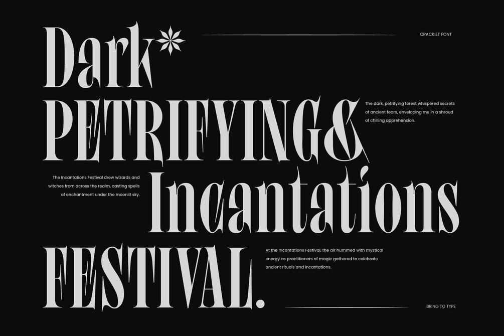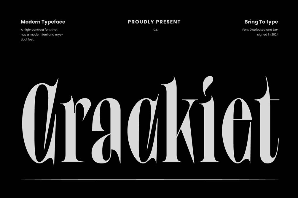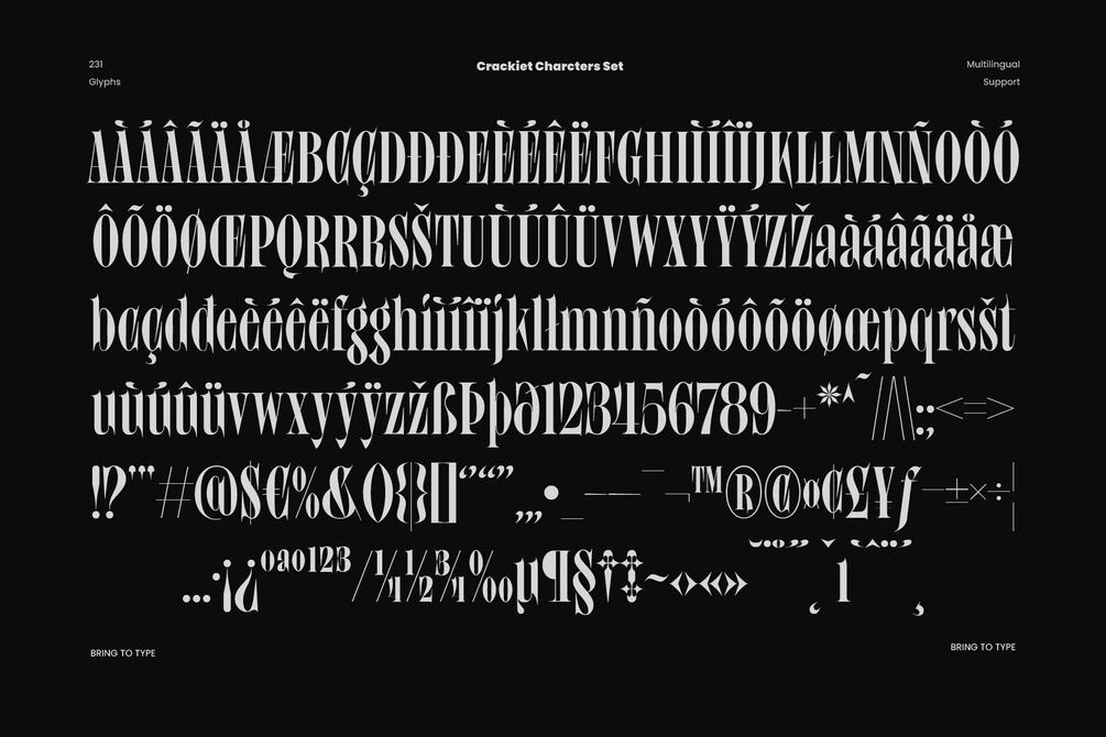 the hallmark of Crackiet font style is the sharp, extreme curves at each terminal, which give the font a Bold, Angry personality. Modern vibes add an extra layer of visual appeal to this font.